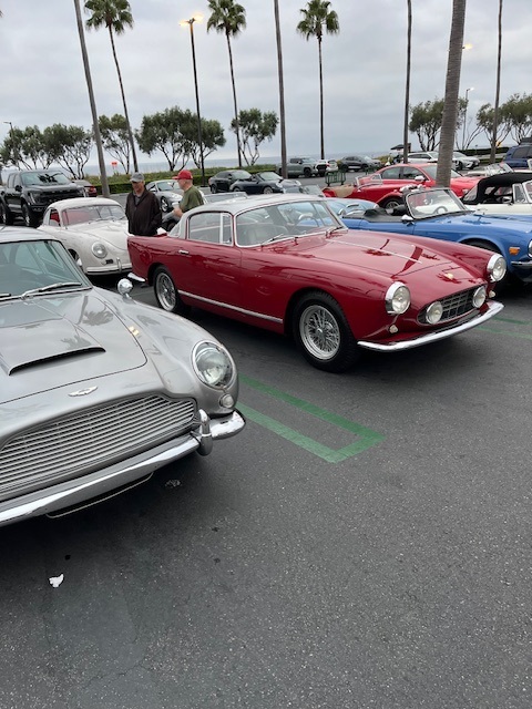 Chuck Lakowski, Bob Bolling and I headed down the coast on Saturday at O 'dark-thirty and arrived at Crystal Cove Shopping Center just as daylight sprang out in its glory! We had a real nice breakfast at the local Parakeet Cafe/Bakery and then we spent time walking among a lovely lineup of wonderful old Austin Healey's and a red Healey that we could not find its owner, Aston Martins, Maserati's, Ferraris, Alfa Romeos, Porsches.